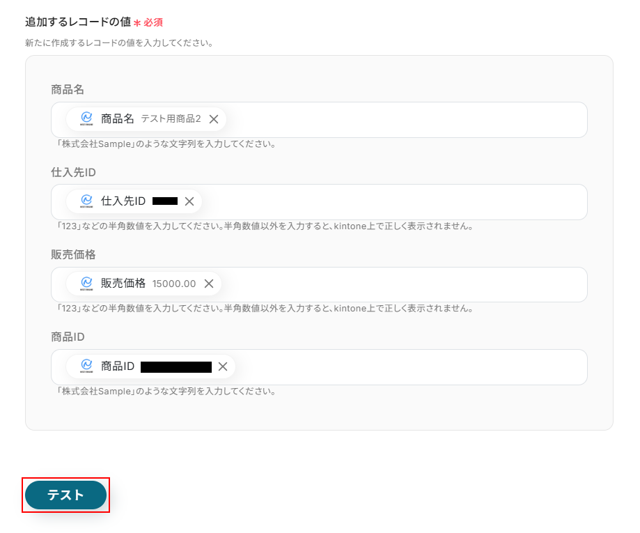 全て設定できたらテスト をクリックしましょう。 ※テストをクリックすると実際にレコードが追加されます。