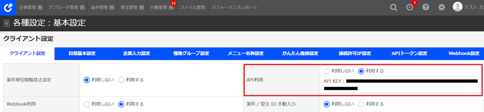 クライアント設定に入り、API利用を「利用する」に変更してください。すると、以下のようにAPI KEYが発行されます。