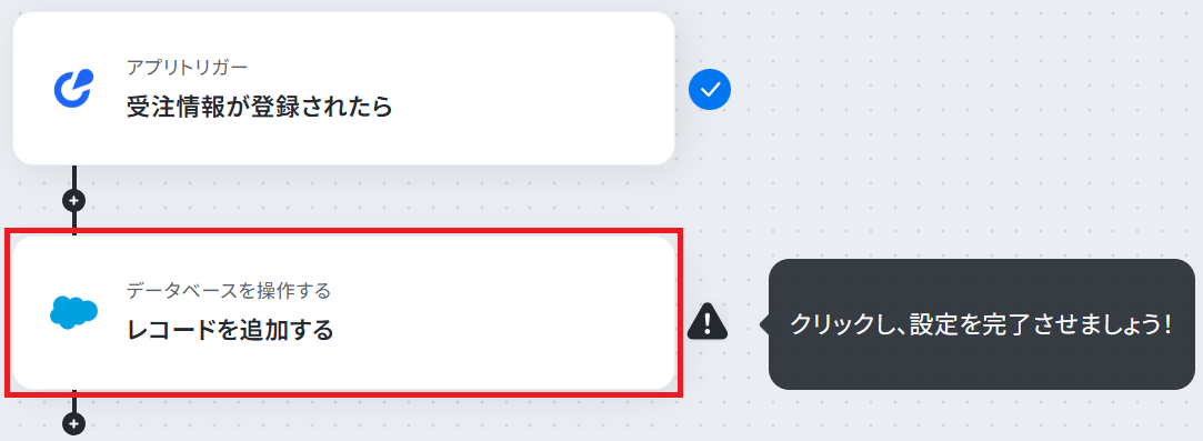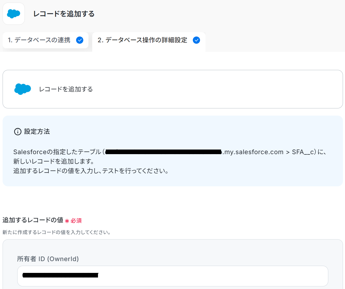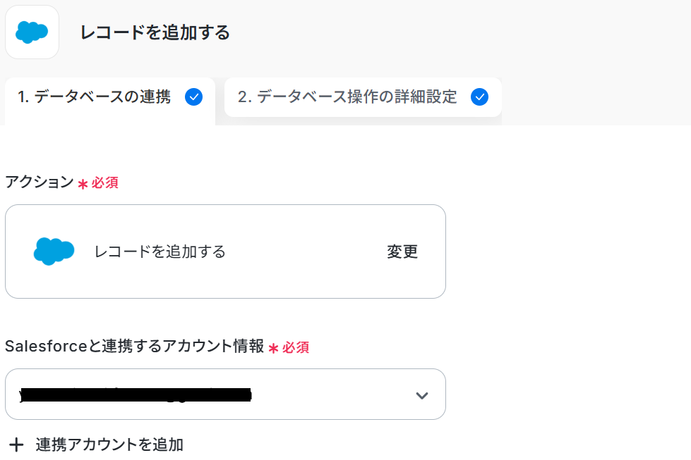 - Salesforceでレコードを追加するアクションでは、追加先のデータベースを指定してください。