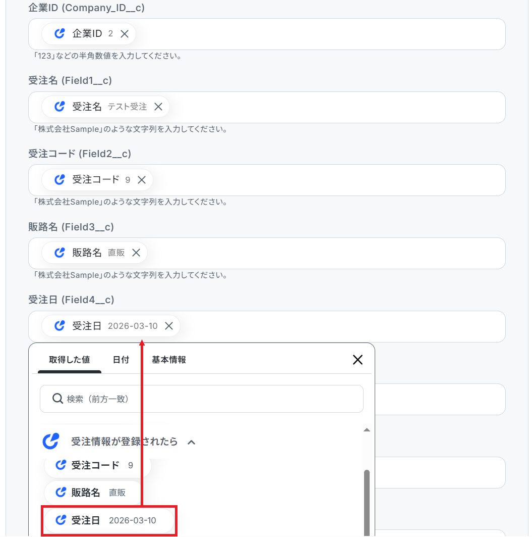 次に、ネクストSFAから取得した値を設定して項目をマッピングしていってください。