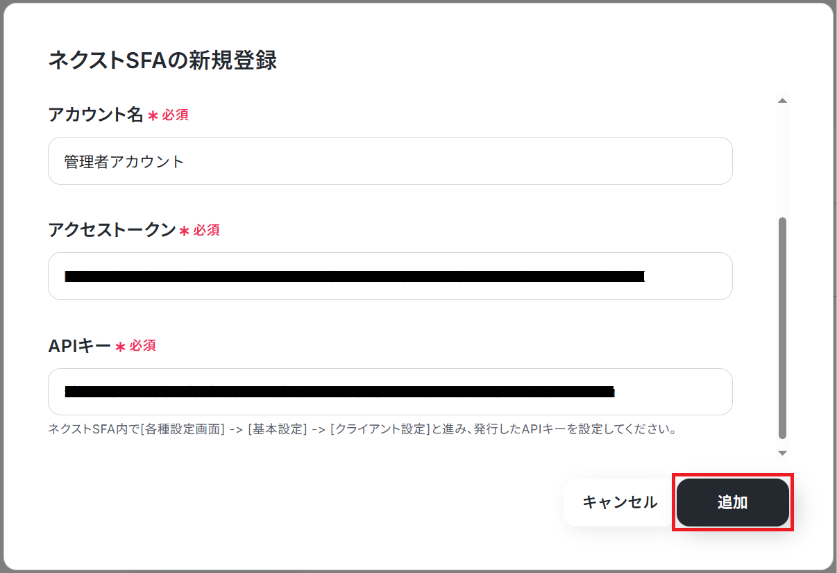 以下の3項目を入力し「追加」をクリックするとマイアプリ連携完了です。