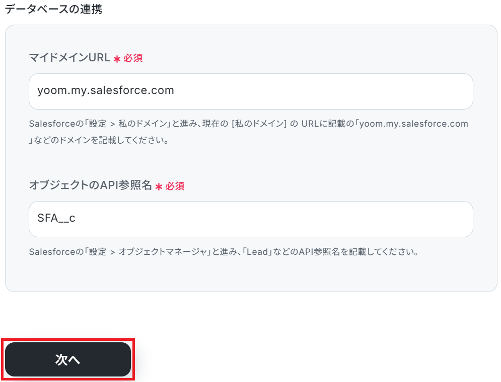 次に、テキストボックス下部の説明を参考にマイドメインURLとオブジェクトのAPI参照名を入力して「次へ」をクリックします。