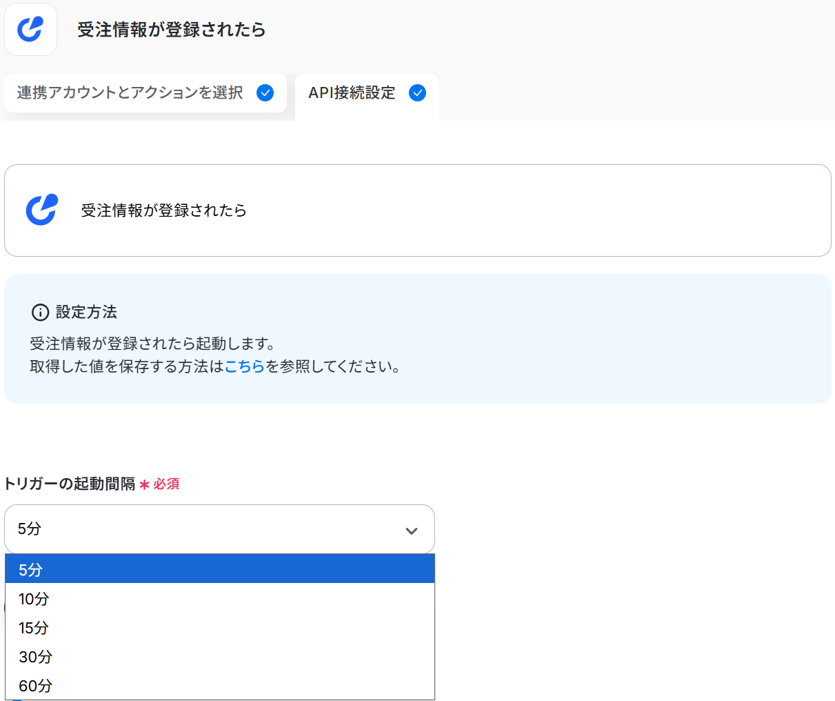 - トリガーは5分、10分、15分、30分、60分の間隔で起動間隔を選択できます。