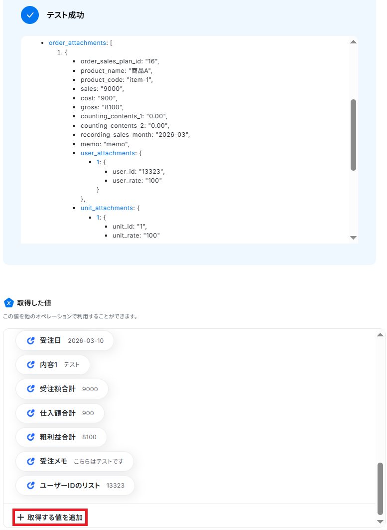 その場合「+ 取得する値を追加」から項目を追加可能です。
