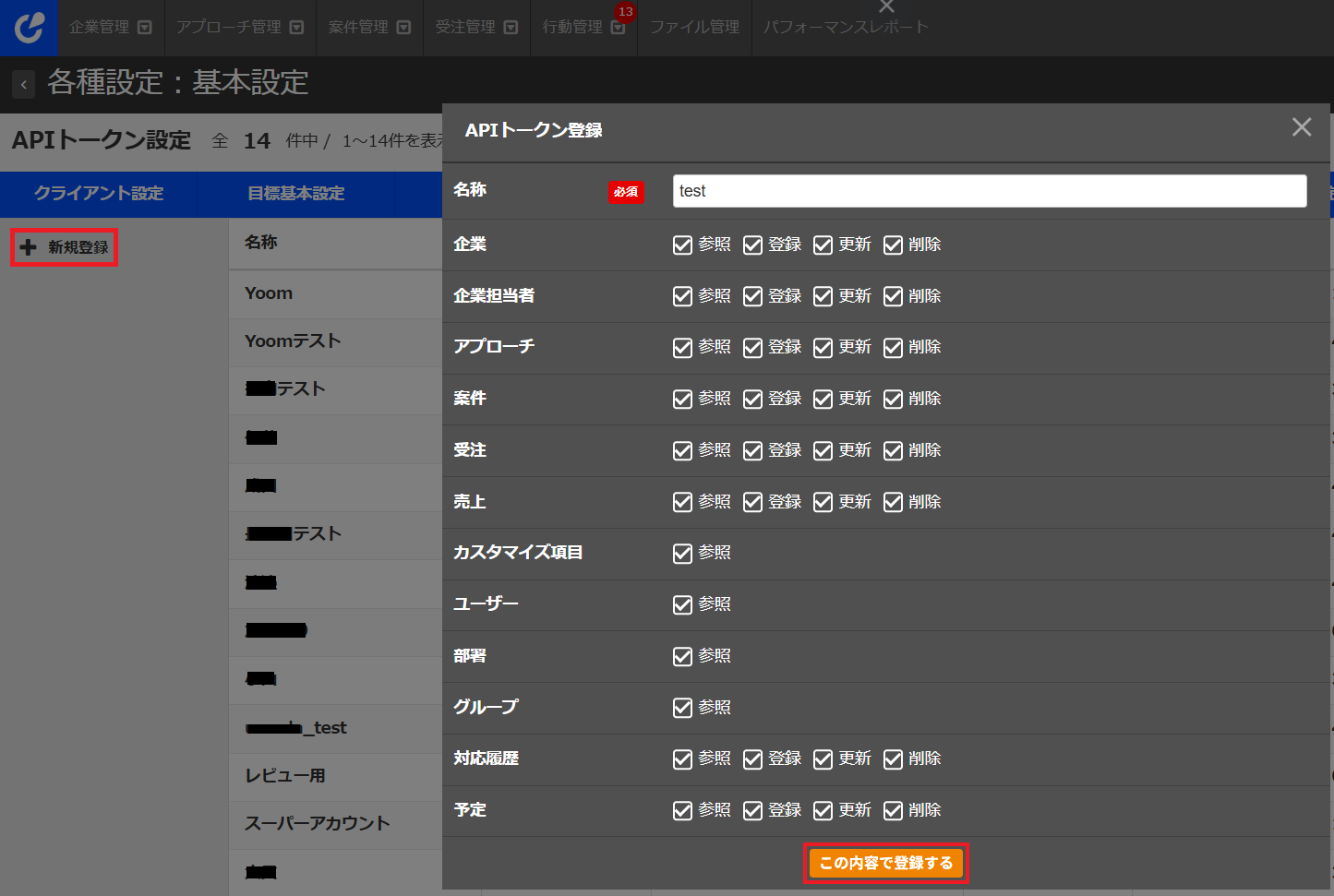 次に基本設定内のAPIトークン設定に移り「+ 新規登録」をクリックしましょう。