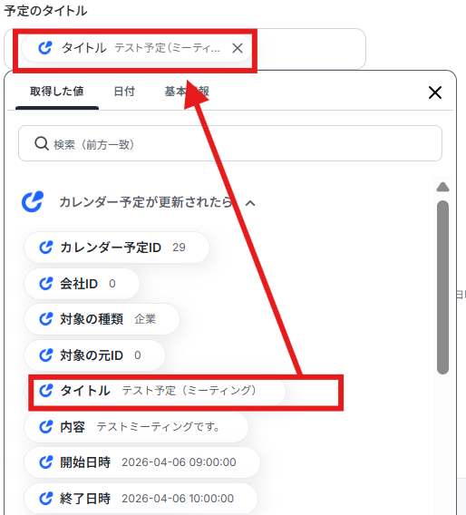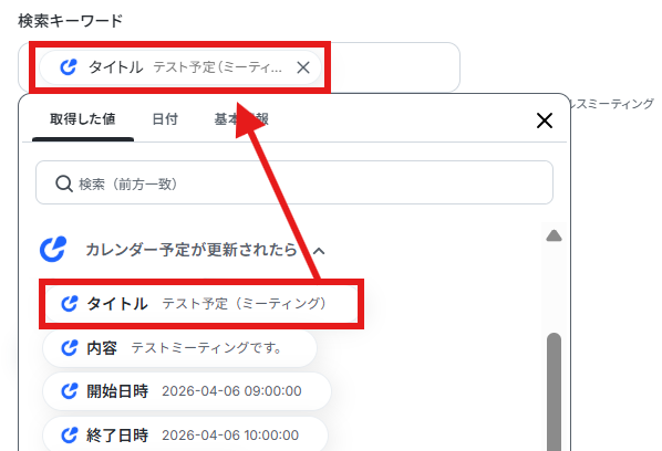 「予定のタイトル」は「カレンダー予定が更新されたら」で取得した値から入力します。