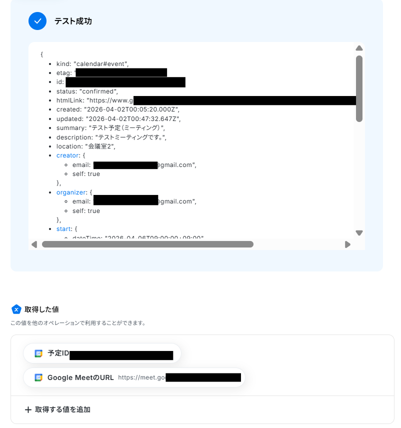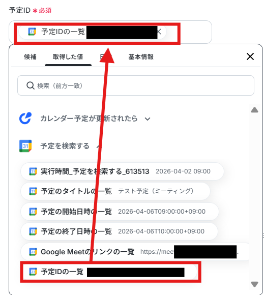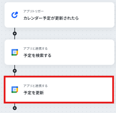 - 最後に、Googleカレンダーの「予定を更新」アクションを設定し、特定した予定をネクストSFAの情報に基づいて更新します。