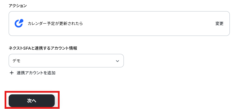 - 次に、トリガーでネクストSFAを選択し、「カレンダー予定が更新されたら」というアクションを設定します。