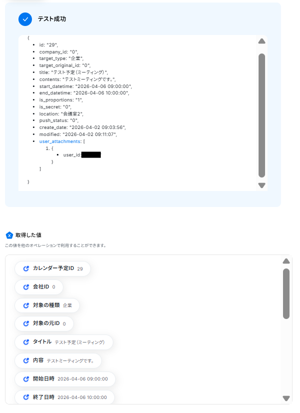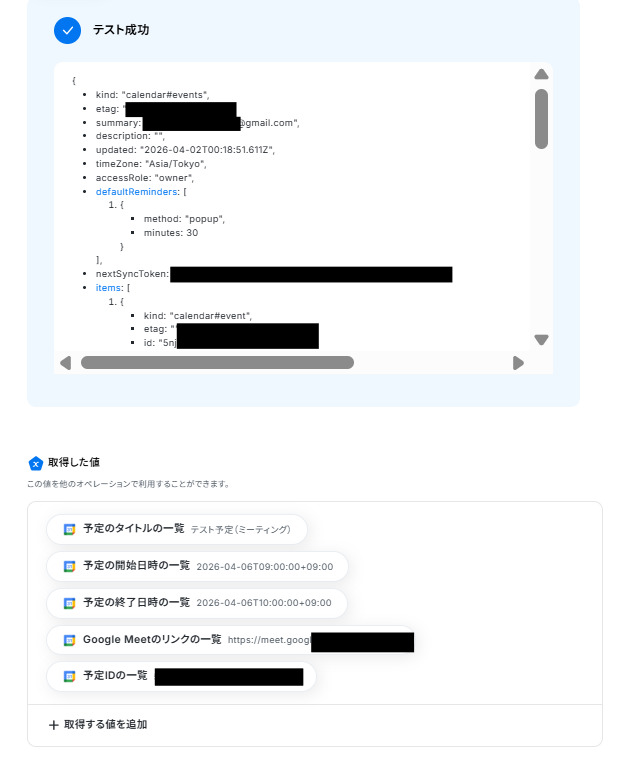 ここまで終わったらテストボタンをクリックしましょう。テストが成功し、取得した値が入ります。