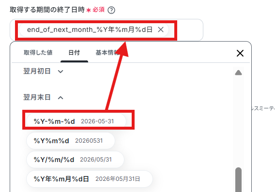 「取得する期間の終了日時」は、日付の「翌月末日」の項目を入力してください。