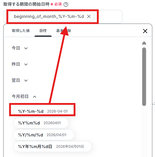 「取得する期間の開始日時」は、日付の「今月初日」の項目を入力しましょう。