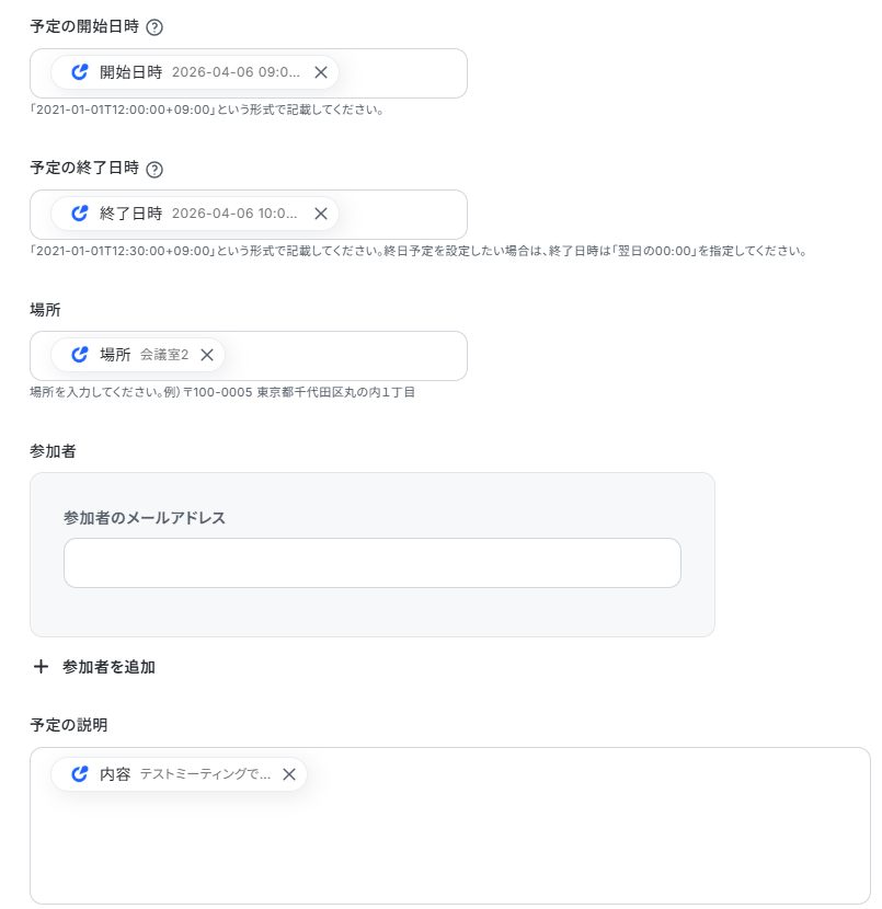 以下の項目も同様に「カレンダー予定が更新されたら」で取得した値などから入力しましょう。