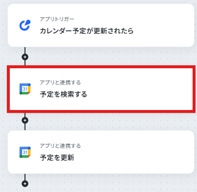 - 続いて、オペレーションでGoogleカレンダーの「予定を検索する」アクションを設定し、更新対象の予定を特定します。