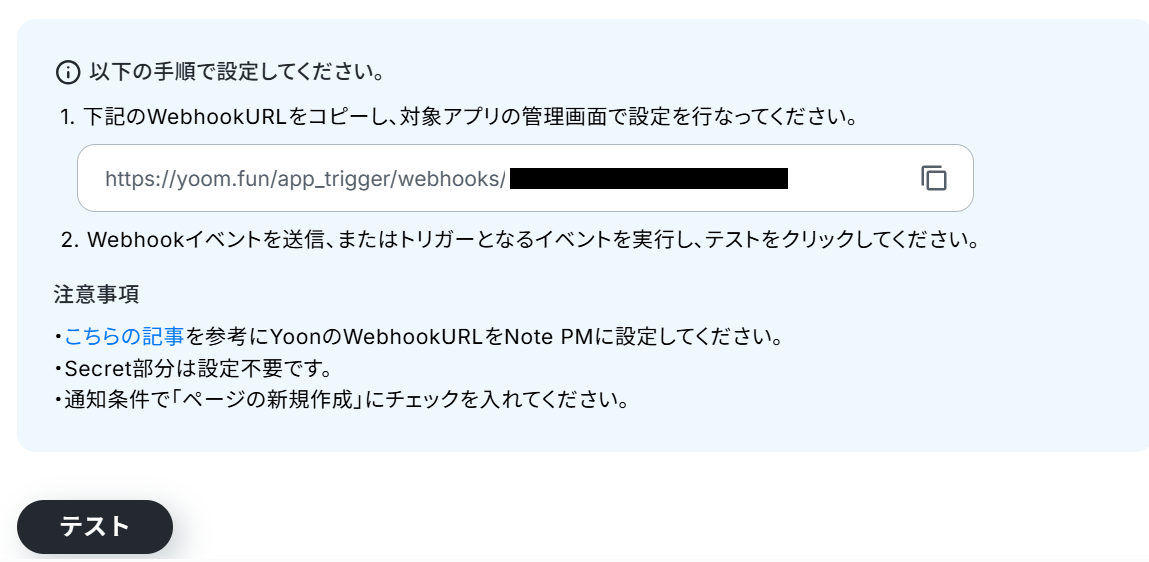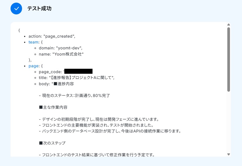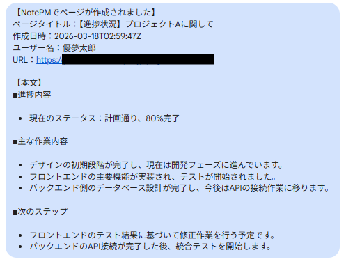 次に、Webhookの動作テストをおこないます。 NotePMにテスト用のページを作成してください。(架空の設定で問題ありません。)