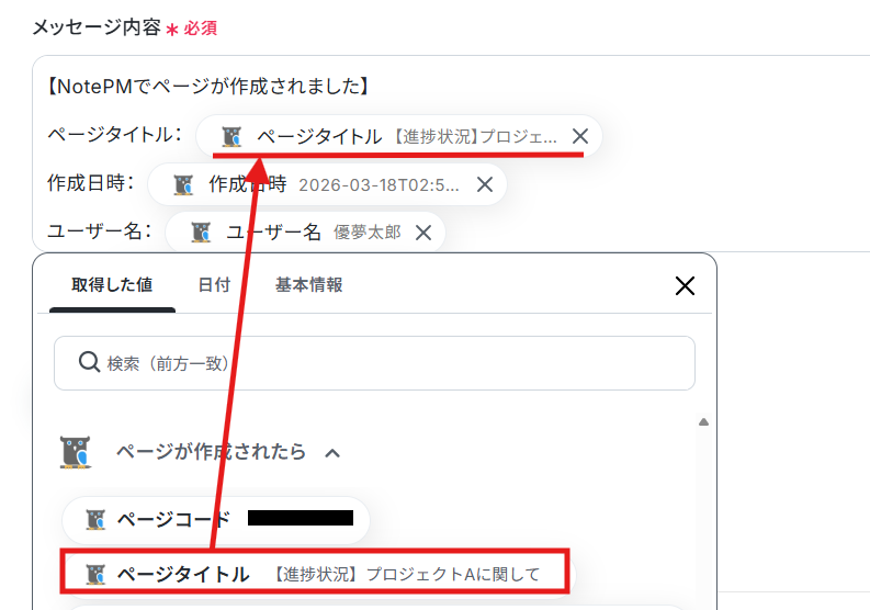 NotePMでページを作成するオペレーションでは、ページのタイトルや本文に、トリガーであるGoogle スプレッドシートの行から取得した特定の列の値を動的に埋め込むことが可能です。例えば、スプレッドシートの「A列:プロジェクト名」「B列:担当者」「C列:更新内容」を、NotePMのページタイトルや本文の適切な箇所に自動で挿入するように設定できます。 NotePMのページを作成するノートや、ページの公開範囲(例:特定のグループのみ、全体公開など)も任意で設定することができます。 ■注意事項