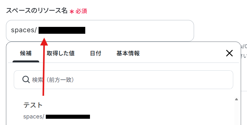 スペースのリソース名は、入力欄をクリックして表示される候補一覧から選択してください。