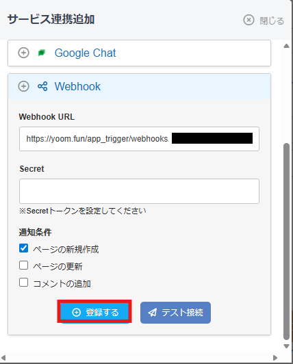 先ほどYoomの画面でコピーした、WebhookURLをペーストしてください。 通知条件は、「ページの新規作成」にチェックし「登録」ボタンをクリックしましょう。