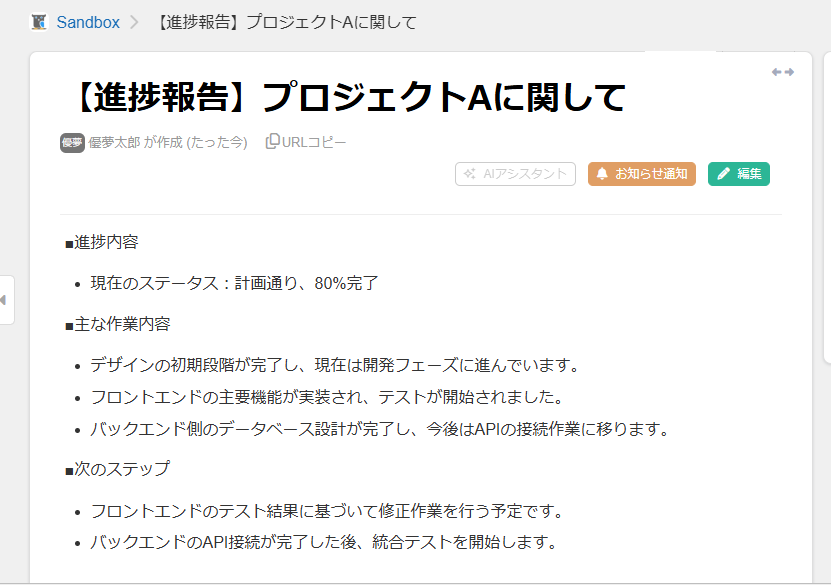 これにより、チームメンバーは情報を迅速に受け取ることができ、情報共有の漏れや遅延がなくなることで、プロジェクトの進行や意思決定がよりスムーズになります。 担当者は通知作成という定型業務から解放され、本来注力すべきコア業務に集中できる環境が整うでしょう!