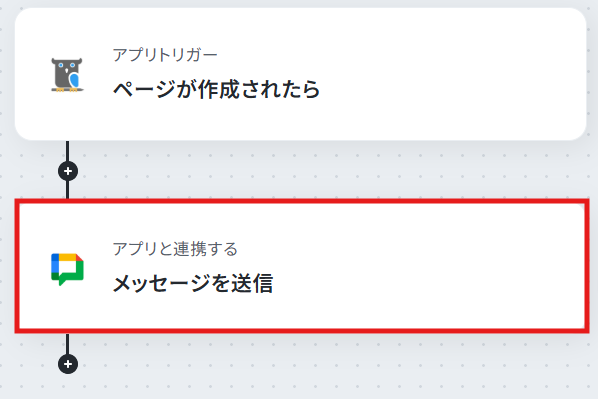 ステップ4:Google Chatにメッセージを送信するアクションの設定 続いて、NotePMに作成したページの情報を引用しGoogle Chatに自動でメッセージを送信する設定を行います。 「メッセージを送信」という項目をクリックしてください。