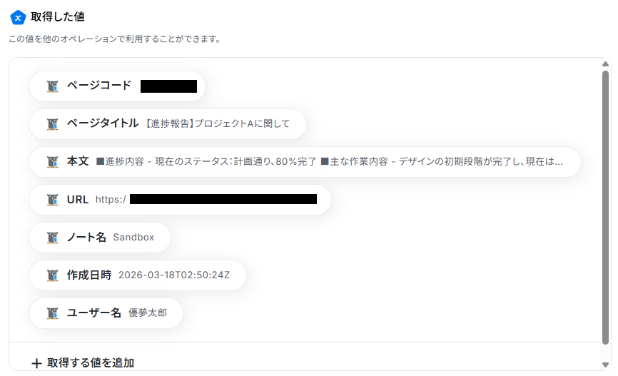 テストが成功すると、NotePMのに作成したページの情報が「取得した値」 に表示されます。 確認できたら、「完了」ボタンをクリックしてください。