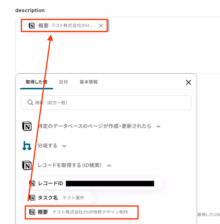 設定が完了したら「テスト」をクリックし、レコードの詳細情報が「取得した値」に抽出されていることを確認しましょう。