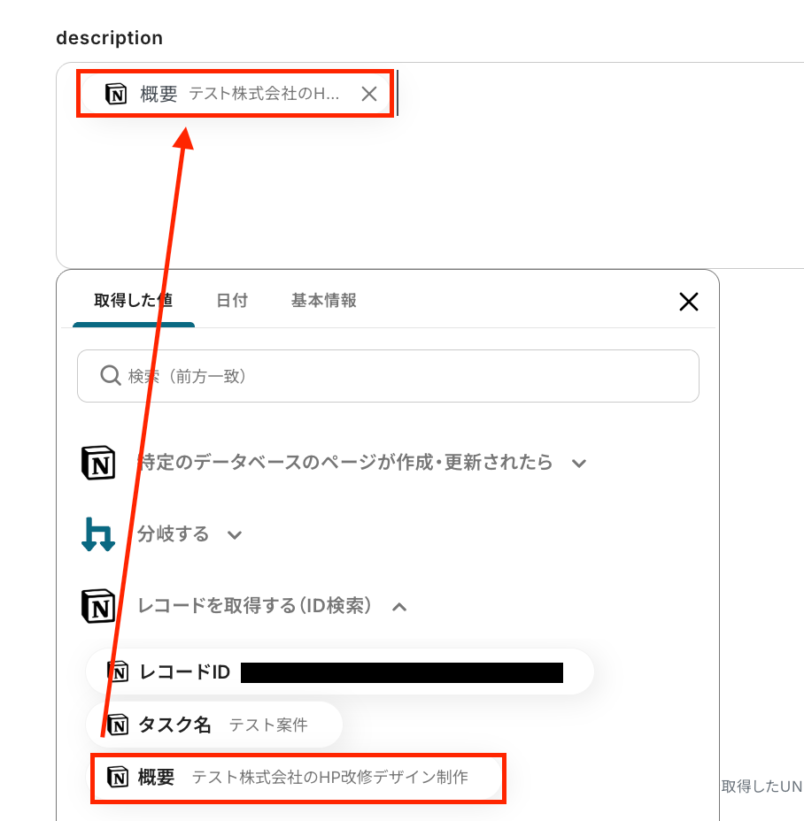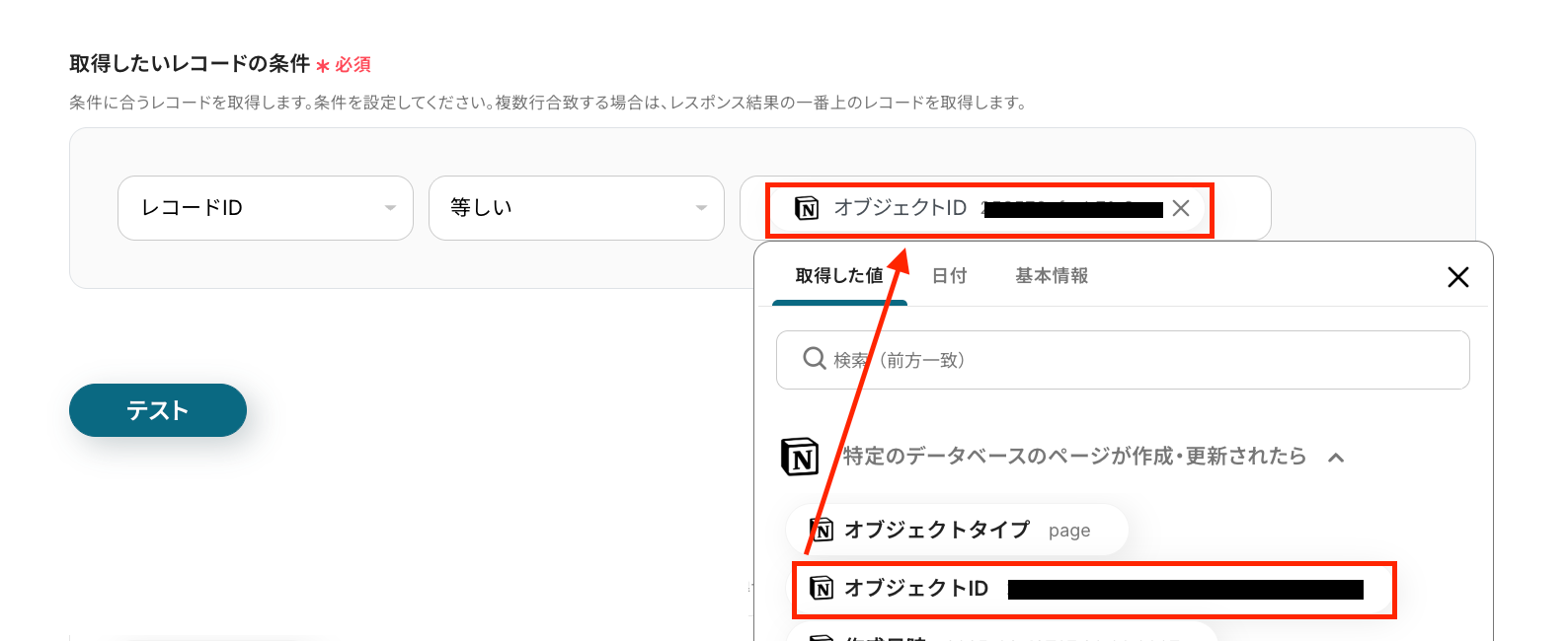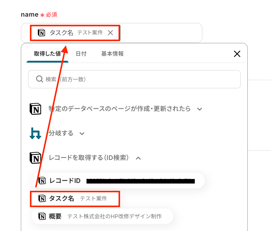 テストが成功すると、先ほどレコードを追加したページの情報が「取得した値」にアウトプットとして抽出されるので、内容を確認しましょう。