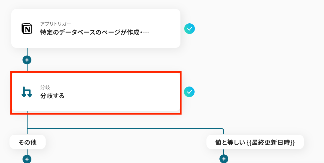 設定されている内容は、Notionから取得した値のうち、「作成日時」と「最終更新日時」の値が一致していることを、後続のアクションへ繋げる条件としていますよ!