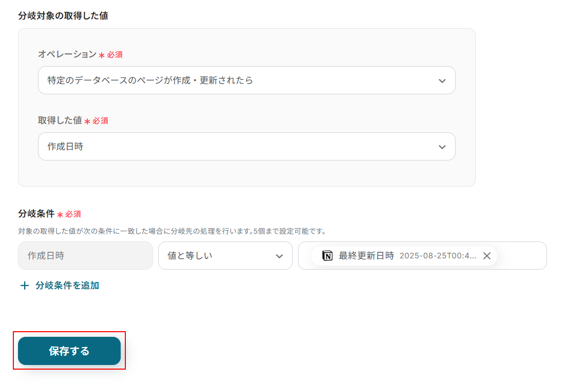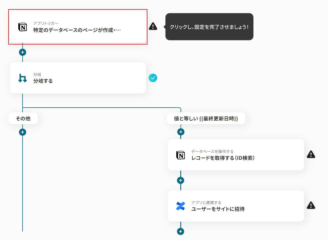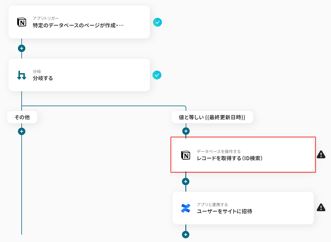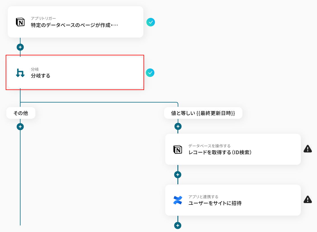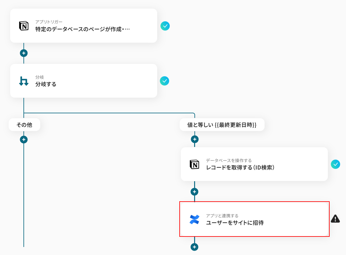 今回のテンプレートではトリガーに、「特定のデータベースのページが作成・更新されたら」が設定されていますが、実際にConfluenceへの招待を行いたいのはページが更新された際ではなくページが新規作成された場合となります。 そのため、更新された場合はConfluenceへ招待を送らないようにしたいですよね。 今回使用するテンプレートでは、分岐条件の項目で取得した値から作成日時と最終更新日時を比較し、等しい場合のみ(新規作成された場合のみ)処理が行われるように設定されています。 今回は新規作成された場合のみを分岐させる処理として利用しましたが、別途分岐条件を追加することも可能です。 分岐について詳しく知りたい方は以下のリンク先をご覧ください。