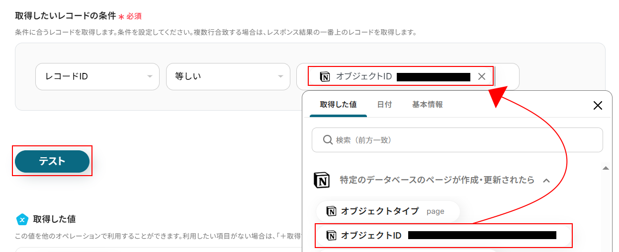 取得したいレコードの条件を設定します。 「レコードID」「等しい」はデフォルトで設定されていますので、右端の入力欄をクリックしてください。 入力欄をクリックすると取得した値が表示されますので、「特定のデータベースのページが作成・更新されたら」から「オブジェクトID」を選択します。 入力欄に表示されたのを確認したら「テスト」をクリックしましょう。