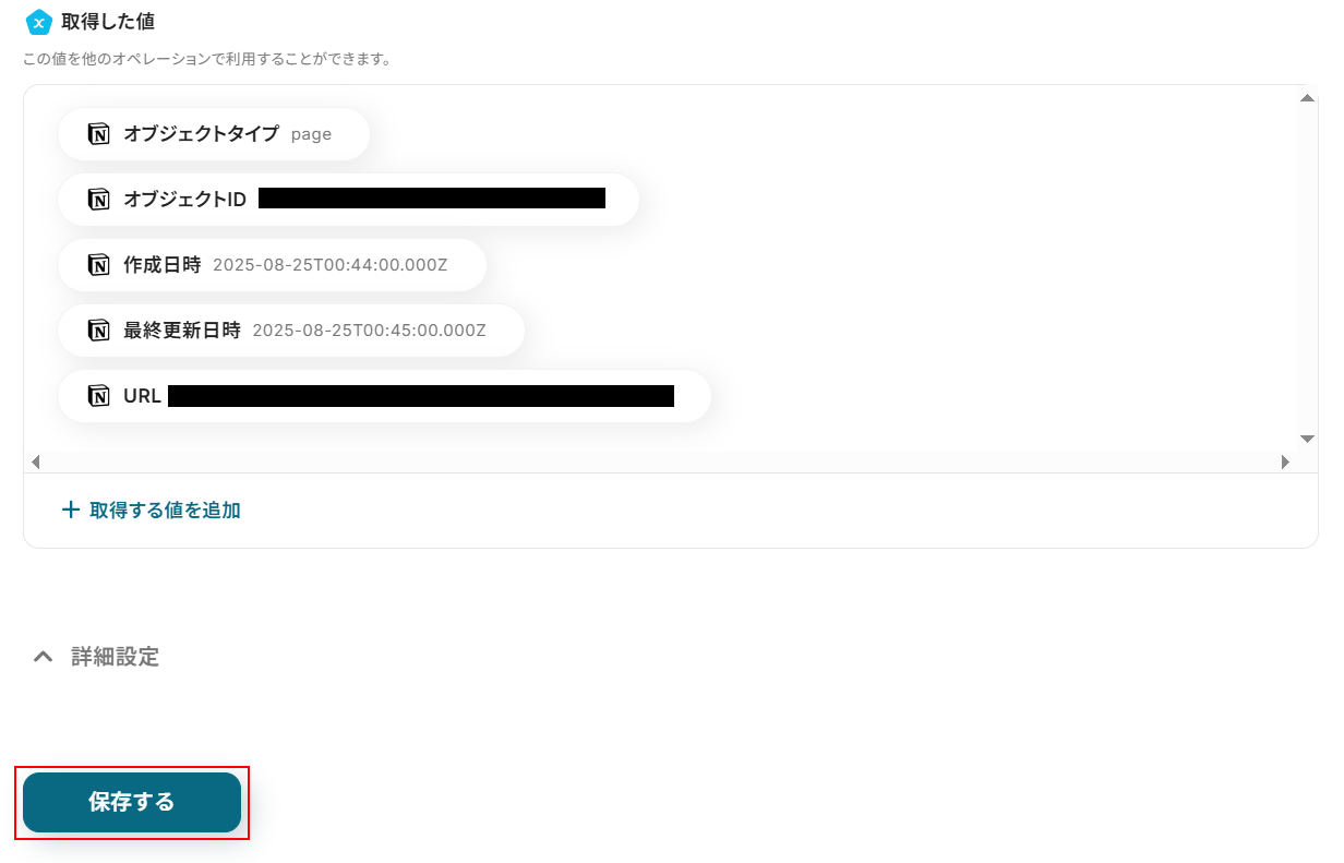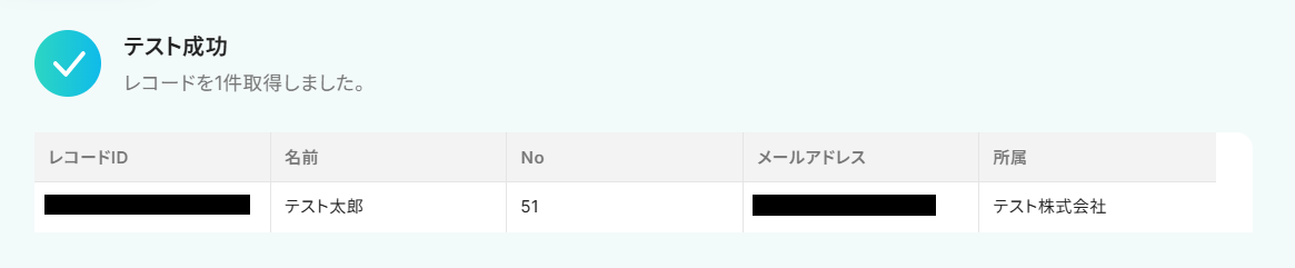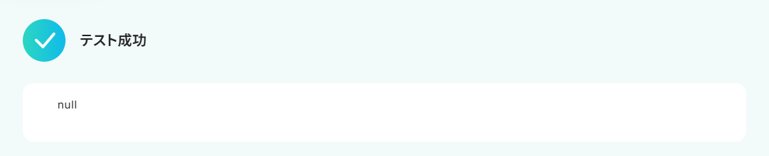 テストに成功するとテスト成功画面が表示され、以下のように取得した値(アウトプット)が表示されます。 取得した値はこのあとの設定でも使用します。 ご興味のある方は、以下のリンク先をご覧ください。