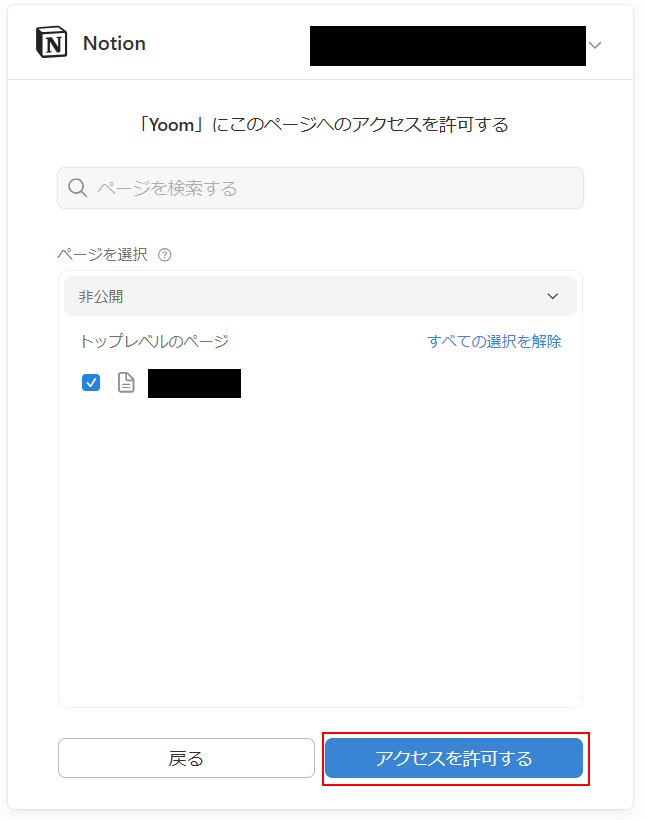 タイトルは任意のものに変更可能ですが、変更がない場合はそのままでも問題ありません。 Notionと連携するアカウント情報には、先ほどと同様にステップ1で連携したアカウントが表示されています。 アカウントを確認し問題なければ次へ進みます。