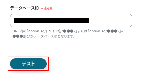 データベースIDを設定します。 データベースIDにはNotionのデータベースのURLを使用します。 Notionのデータベースページをフルページとして開き、URLをコピーしたらYoomの画面に戻り注釈を確認しながら入力してください。 入力できたら「テスト」をクリックしましょう。
