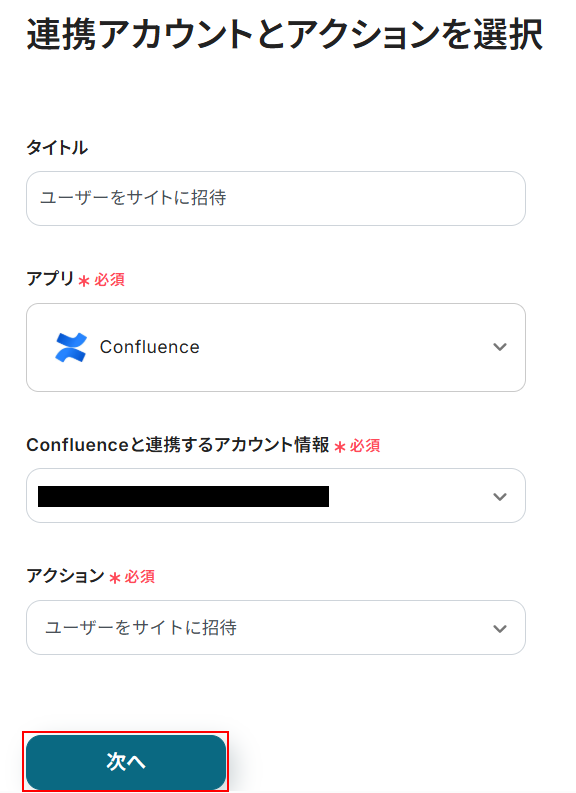 タイトルは任意のものに設定可能ですが、変更がなければそのままでも問題ありません。 Confluenceと連携するアカウント情報には、ステップ1で連携したアカウントが表示されています。 アカウントを確認し問題なければ「次へ」をクリックしてください。