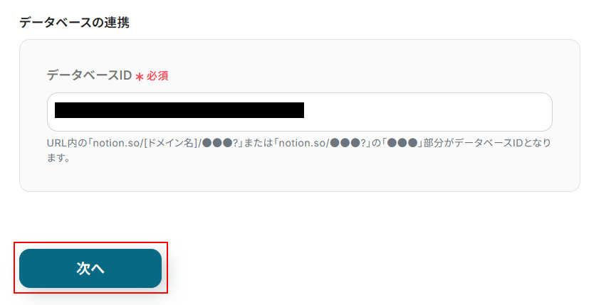 データベースIDを設定します。 注釈を確認しながら先ほど「特定のデータベースのページが作成・更新されたら」で設定したものと同じものを入力してください。 入力できたら「次へ」をクリックしましょう。