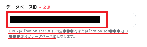 次に、Notion上で更新される予定のデータベースIDを入力します。Notionで該当データベースのページにアクセスして、URLからIDを抽出しましょう。