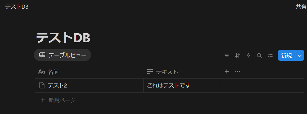 入力できたら、一度Notionの該当ページにあるデータソースを更新しておきましょう。今回はテスト用のデータソース内に、以下のように情報を入力しておきました。