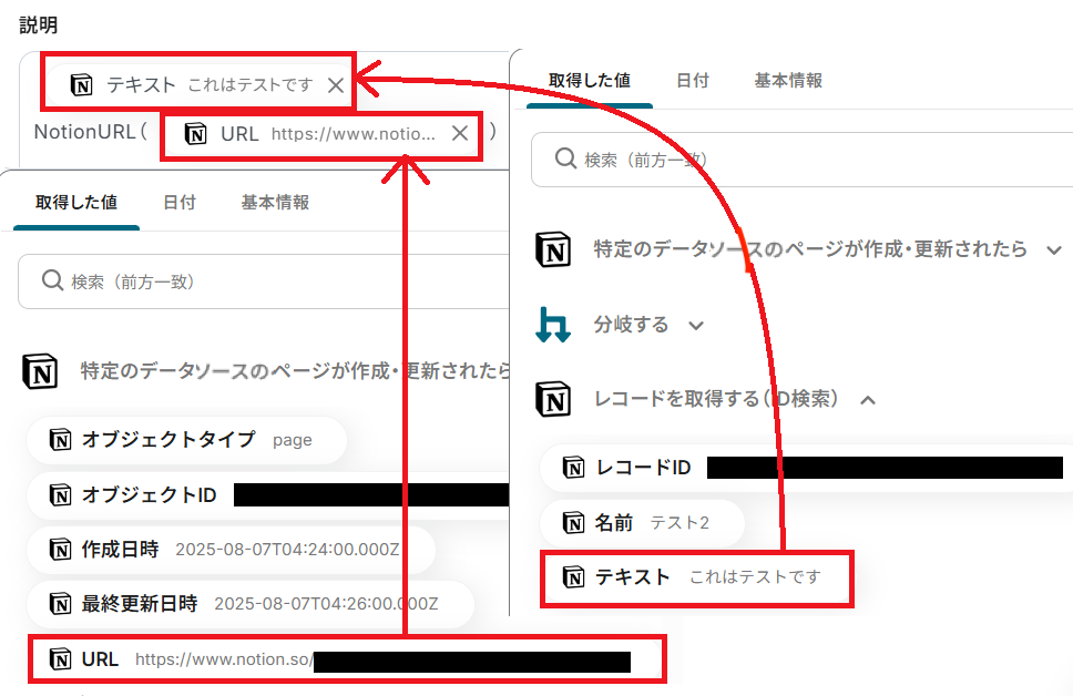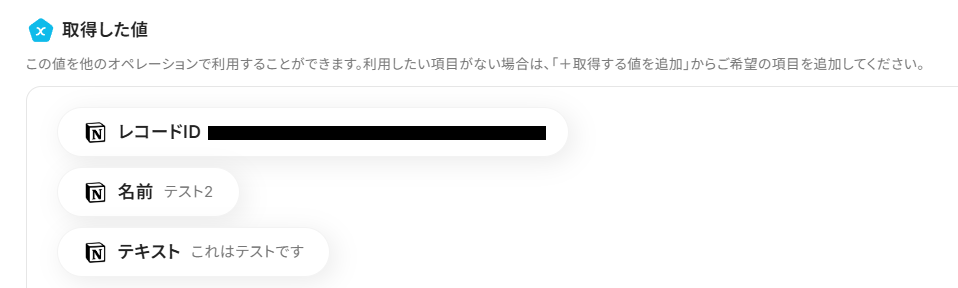 ここで「テストボタン」を押してみましょう。取得した値に、先ほど更新したNotionデータベースの内容が反映されていれば成功です!