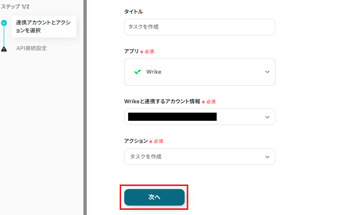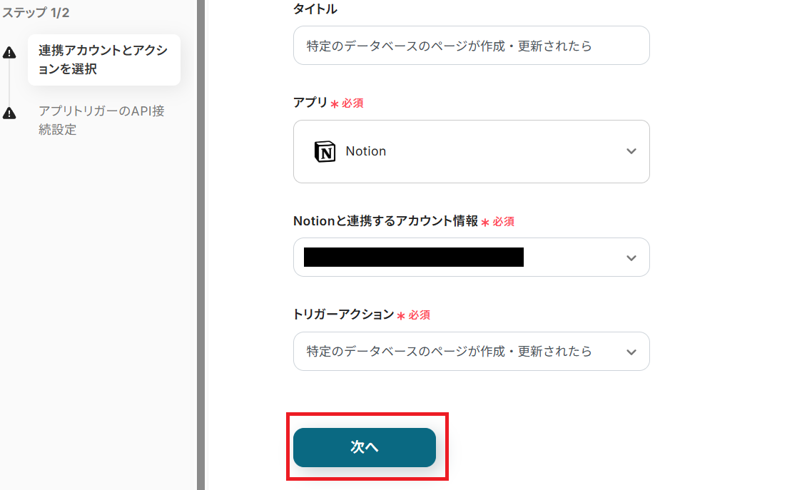 タイトルを任意で設定し、Notionと連携するアカウントやアクション内容を確認したら「次へ」を押してください。