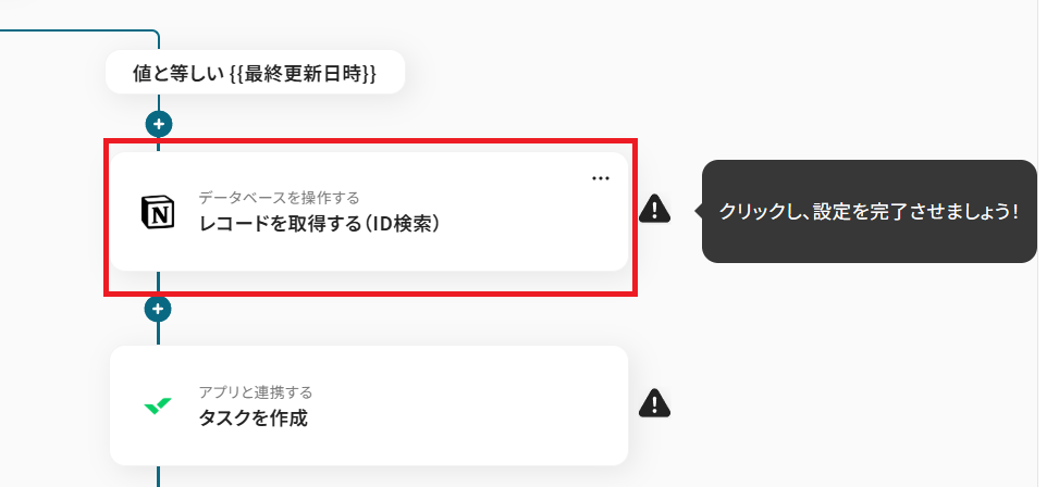 前ステップで設定した分岐条件を満たした場合のみ、ページ内の詳細な情報を取得するアクションに進みます。「レコードを取得する(ID検索)」をクリックしてください。