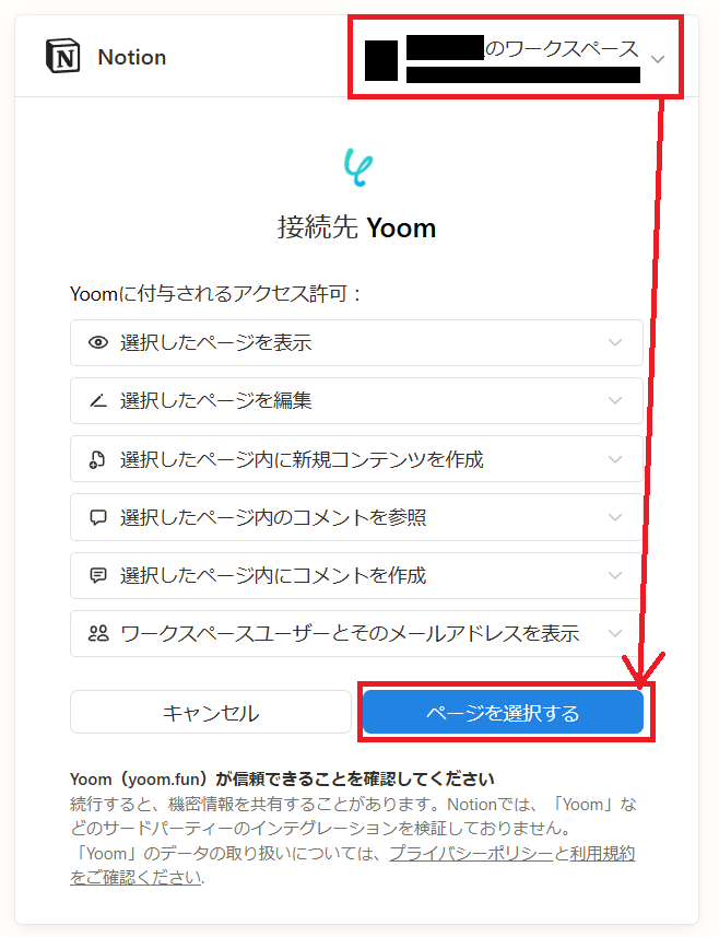 Notionのアイコンをクリックすると、以下の画面が表示されます。右上で任意のワークスペースを設定し、「ページを選択する」をクリックしましょう。