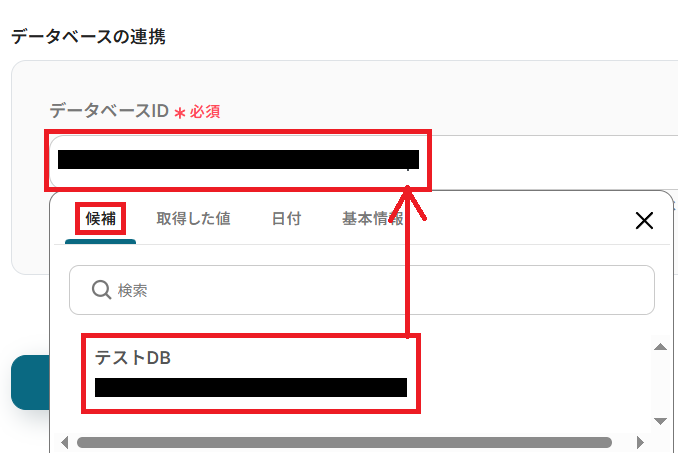 データベースIDには、アプリトリガーで設定したIDと同じものを入力してください。ちなみにボックスをクリックすると、以下のように「候補」として先ほど設定したデータベースが出てくるため、こちらをクリックすると簡単です!