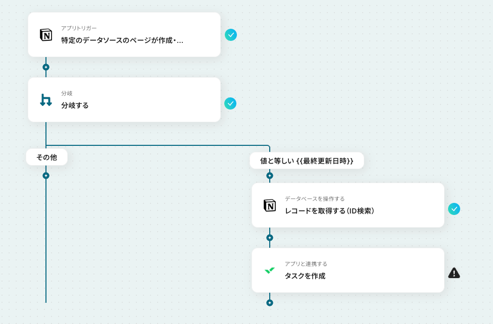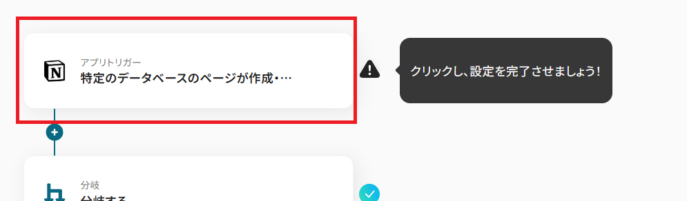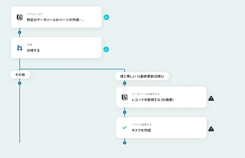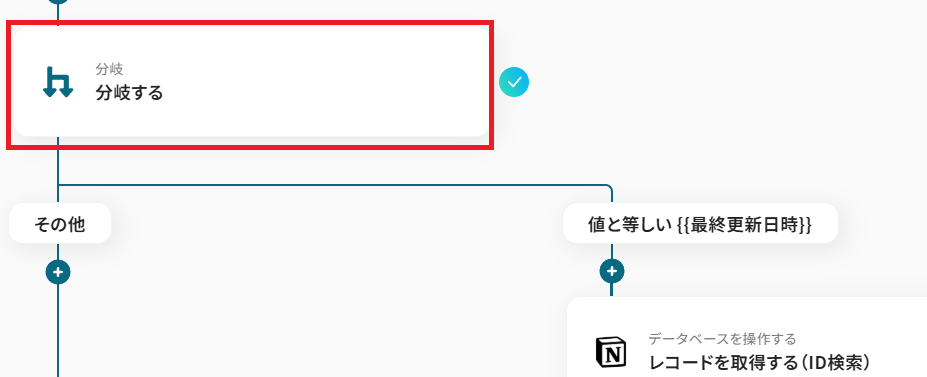 Yoomの「分岐する」オペレーションを使用して、Notion側でページが作成されているかどうかを判別しましょう。条件を満たした場合のみ、次のアクションに進むよう設定が必要です。