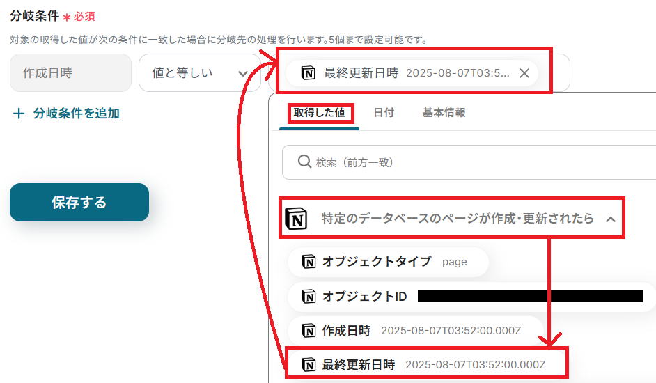 分岐条件は「作成日時が最終更新日時と等しい」となるように設定します。