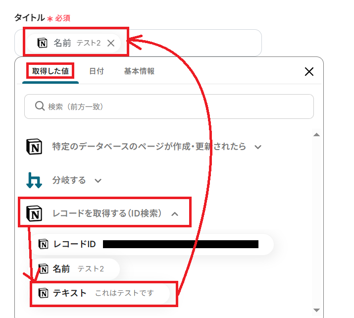 タイトルは任意で設定してください。分岐対象には先ほどのステップで取得した値を使います。以下のように設定してください。