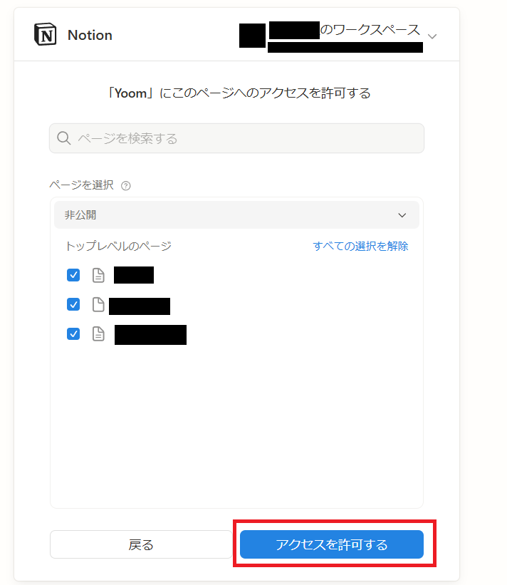YoomがアクセスできるNotionのページを選択します。任意のものにチェックを入れて、「アクセスを許可する」を押してください。