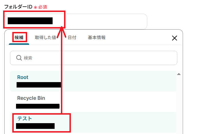 「フォルダID」はボックスをクリックすると、候補としてすでに連携しているWrikeのフォルダーがプルダウンから選べます。任意のフォルダーを選んで入力してください。