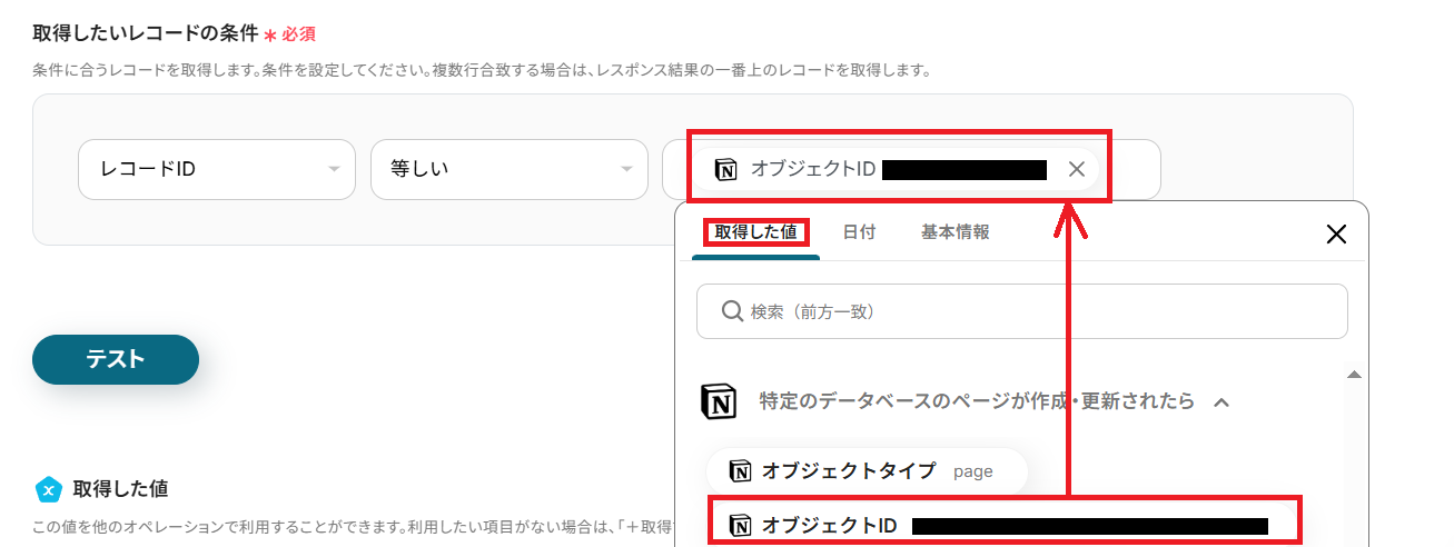 取得したいレコードの条件を設定します。「レコードIDがオブジェクトIDと等しい」という条件を設定するため、取得した値から以下のように入力してください。