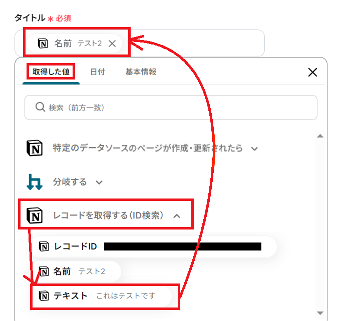 Wrikeに作成するタスクのタイトルを設定していきます。ここでは取得した値から、Notionに追加されたレコードの「名前」を入力しましょう。