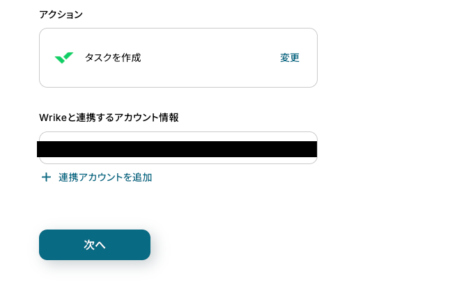 タイトルを任意で設定し、Wrikeと連携するアカウントやアクション内容を確認したら「次へ」を押してください。