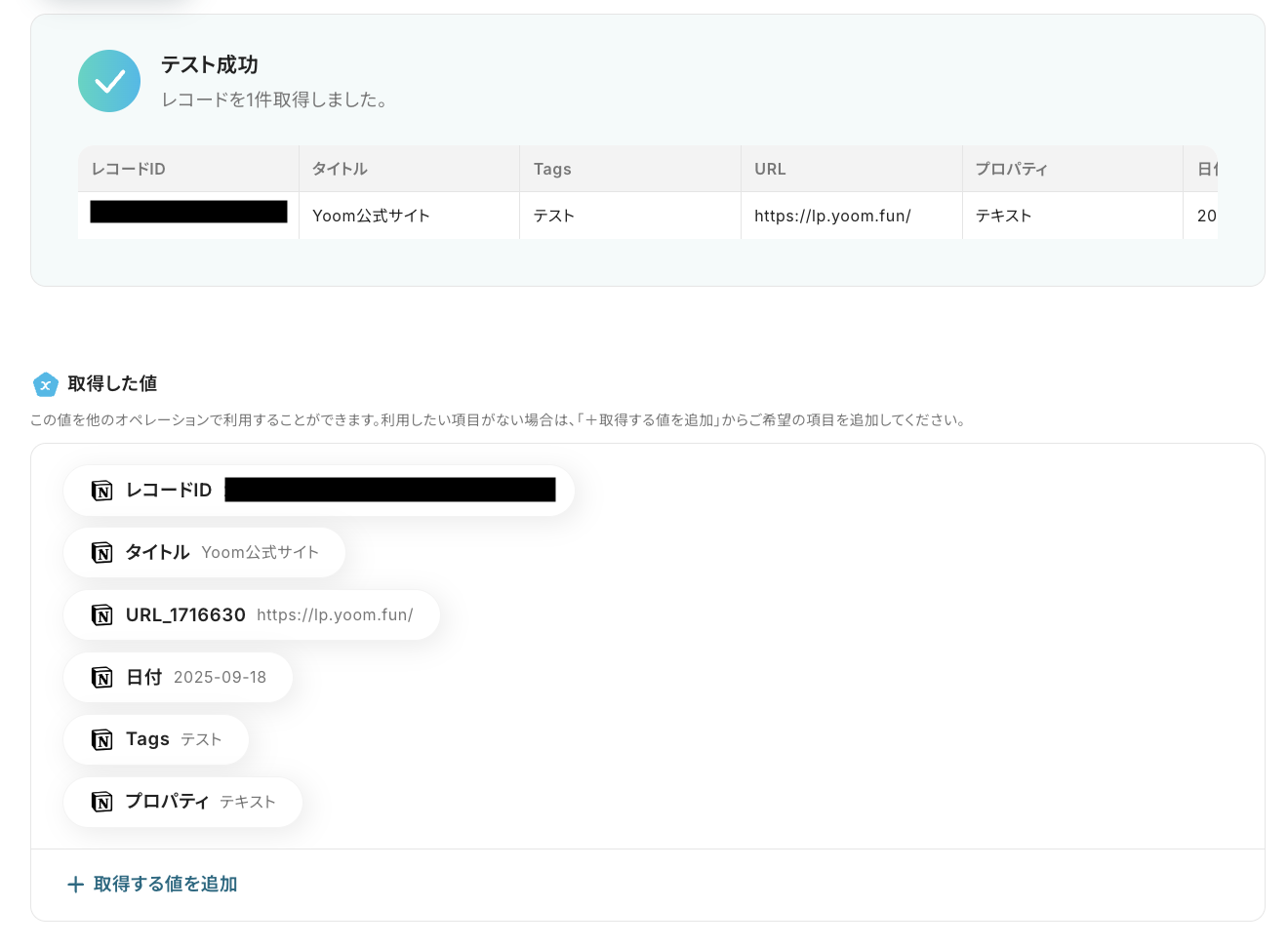 テストに成功すると、Notionで新たに作成されたページ(レコード)に関する情報が一覧で表示されます。 以下の画像の取得した値は後続のステップで利用可能です。